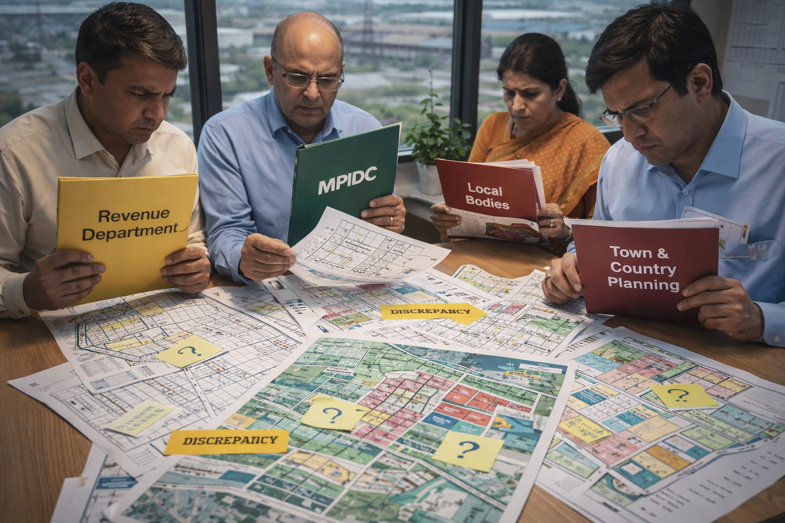 Industrial land information was maintained separately by MPIDC, Revenue Department, Town & Country Planning, and local bodies. This fragmentation resulted in inconsistent data, frequent mismatches in plot details, and delays in land verification.