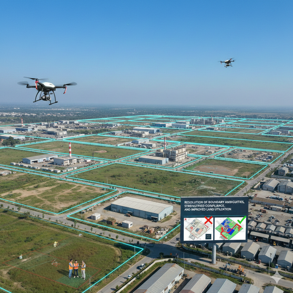 Industrial areas and plots were mapped using DGPS surveys and drone imagery to establish accurate spatial boundaries. This significantly reduced boundary ambiguities and minimized disputes between authorities and allottees.